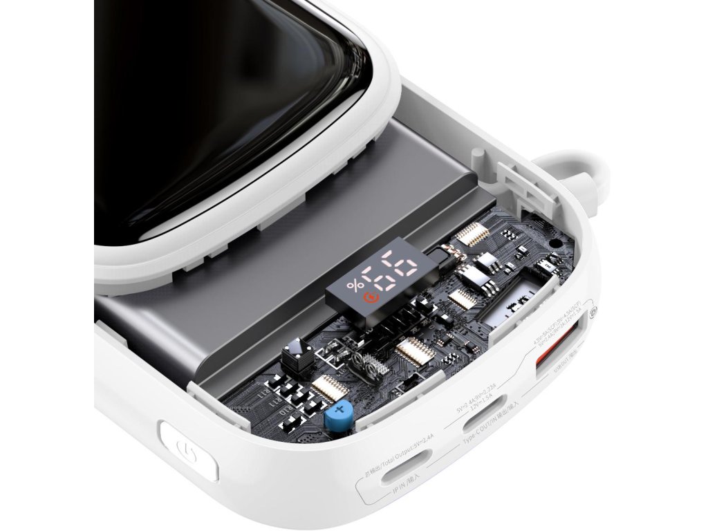 Powerbank Baseus je produkt, ktorý vás prekvapí svojím spracovaním. Zariadenie je malé a praktické, ale vyznačuje sa značnou kapacitou - až 20000 mAh. Na bočnej strane zariadenia sa nachádza výsuvný kábel typu USB-C, takže k nemu môžete okamžite pripojiť telefón a začať nabíjať. Ďalším pozoruhodným prvkom je rukoväť, pomocou ktorej môžete powerbanku pohodlne prenášať alebo ju pripevniť napríklad na batoh.