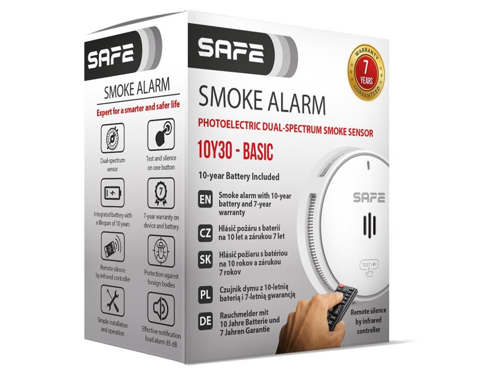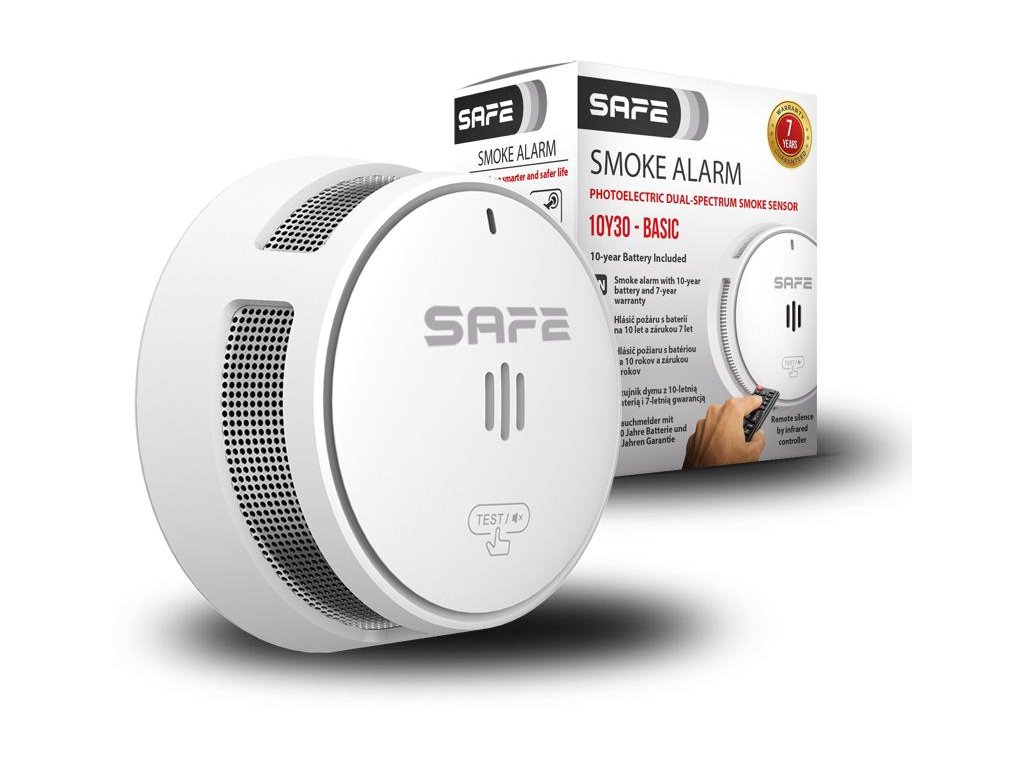 Nová generácia hlásičov požiaru s prelomovou dvojspektrálnou optickou detekciou prachu v komore a technológiou SIC na dočasné stlmenie poplachu prostredníctvom IR diaľkového ovládania. Napájanie zabezpečuje integrovaná lítiová batéria (vstavaná, nevyberateľná), ktorá zaručuje výnimočne dlhú životnosť viac ako 10 rokov a predĺženú 7-ročnú záruku na batériu aj samotné zariadenie. Požiarny hlásič SAFE 10Y30 - BASIC predstavuje novú úroveň štandardov v oblasti požiarnej bezpečnosti v obytných priestoroch.
