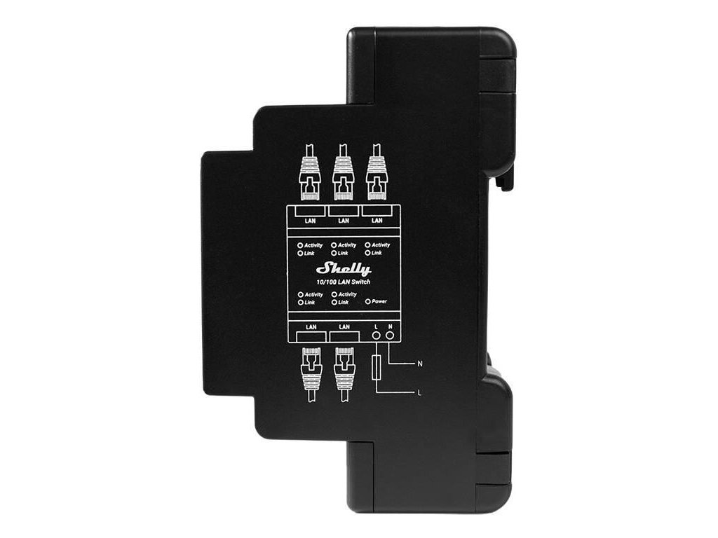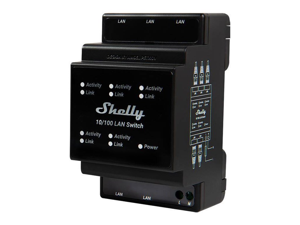 Prepínač Shelly LAN je 5-portový ethernetový prepínač s rýchlosťou 10/100 Mb/s, ktorý sa montuje na DIN a je napájaný priamo zo siete 110-230 V AC, určený na prevádzku v rozvádzači a integráciu do série Shelly Pro.
