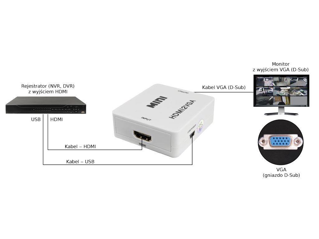 - Použitie: Prevodník HDMI-VGA umožňuje pripojiť zariadenia, t. j. rekordéry CCTV (DVR, NVR) vybavené zásuvkami HDMI k monitorom vybaveným iba vstupom VGA (D-Sub)