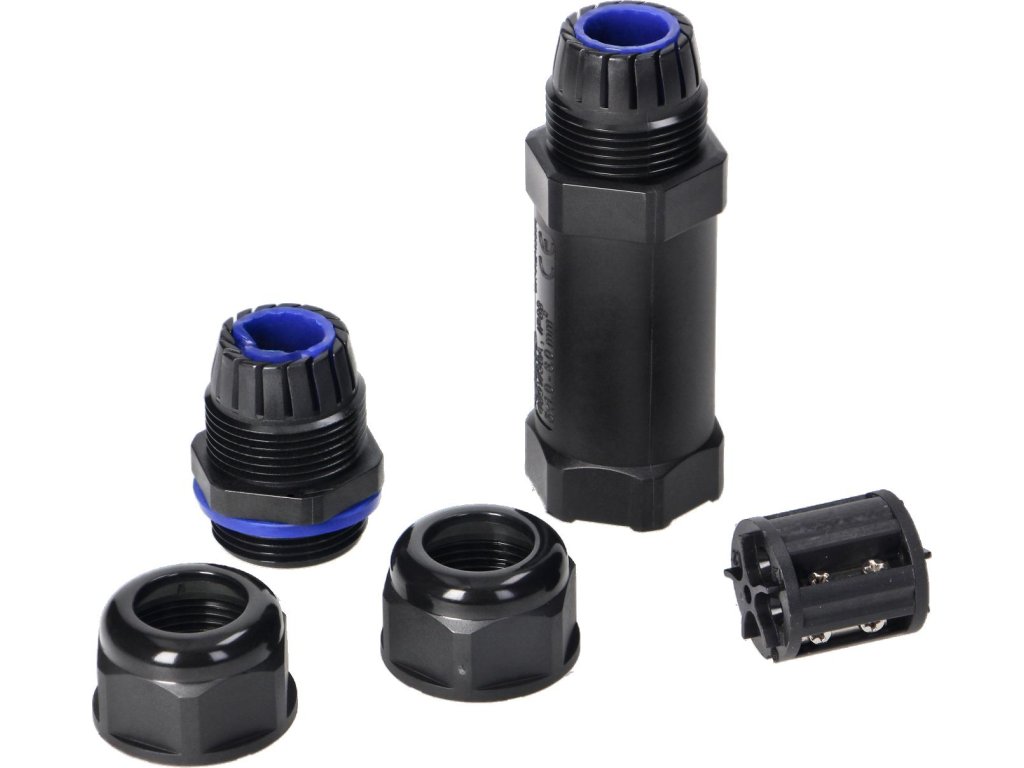 Káblový konektor s jednoduchým tvarom a vysokým stupňom krytia IP68, ktorý zaručuje ochranu proti vonkajším vplyvom. Má dobre priliehajúce tesnenie bloku konektora a hrubé gumové tesnenie na vývodke, ktoré dôkladne utesňuje vložené káble. Materiál použitý na konektor je odolný voči UV žiareniu a vhodný na vonkajšie použitie. Kontakty sú vyrobené z mosadze, dodatočne chránené proti oxidácii vrstvou niklu.