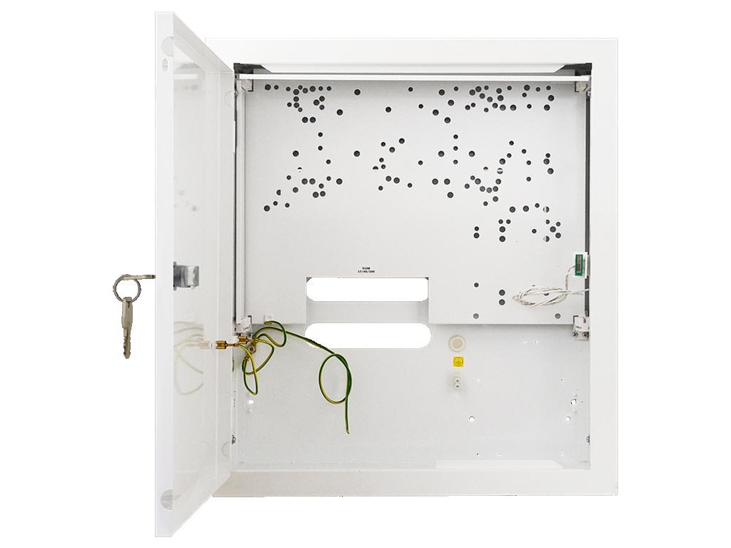 Skriňa na zapustenú montáž 17/40/M-F/PUSTA Použitie: DSC, PARADOX, RISCO, SATEL, PYRONIX, TEXECOM, TELMOR, ROGER, EBS, PULSAR Vonkajšie rozmery skrine: Š=350, V=400, D+D1=100+8 [+/-2 mm] Vonkajšie rozmery príruby: W1=385, H1=430 [+/-2 mm] Priestor nDodatočné parametre