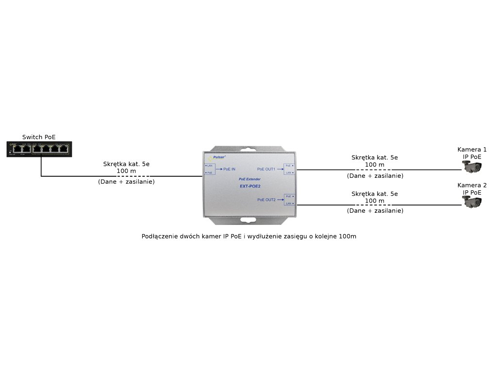 Extender EXT-POE2 je zariadenie určené na predĺženie prenosovej vzdialenosti napájania PoE a dátového Ethernetu prostredníctvom krútenej dvojlinky UTP cat. 5/5e o ďalších 100 m. Extender je napájaný z prepínača PoE alebo iného zariadenia kompatibilného s PoE (vstup PoE IN). Výstupné napätie a údaje sú k dispozícii na výstupoch PoE OUT1, PoE OUT2, ku ktorým by mali byť pripojené kamery alebo iné IP zariadenia využívajúce PoE napájanie.Maximálny záťažový prúd je 0,4 A (0,3 A/port). Na prenos energie na portoch PoE OUT1, PoE OUT2 sa používajú páry 4/5 (+) 7/8(-), ktoré sa podľa normy Ethernet nepoužívajú na prenos dát (prenos dát sa uskutočňuje pomocou párov 1/2 a 3/6).