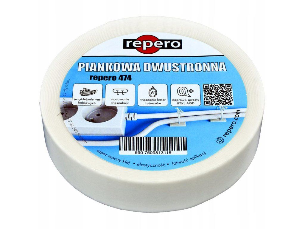 REPERO 474 je biela, penová obojstranná lepiaca páska na PE penovom podklade, potiahnutá super silným lepidlom na báze syntetického kaučuku. Výrobok je určený na trvalé lepenie rôznych typov komponentov v domácnosti, kancelárii a technických aplikáciách.