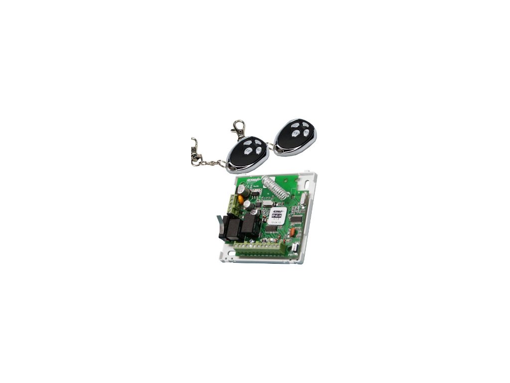433 MHz, superheterodyn, anténa zabudovaná v doske plošných spojov, 4 kanály, puzdro na povrchovú montáž, dve diaľkové ovládania TR-4, dosah do 150 m.