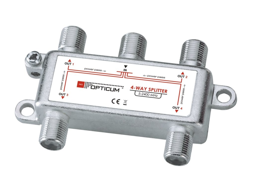 Rozdeľovač na distribúciu jedného signálu do štyroch prijímačov. 4-násobný satelitný rozdeľovač od renomovanej značky OPTICUM. Pracuje v pásmach 5-2400 MHz. Prechádza napätie.