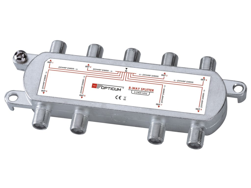 Rozdeľovač na distribúciu jedného signálu do ôsmich prijímačov. 8-násobný satelitný rozdeľovač od renomovanej značky OPTICUM. Pracuje v pásmach 5-2400 MHz. Prechádza napätie.