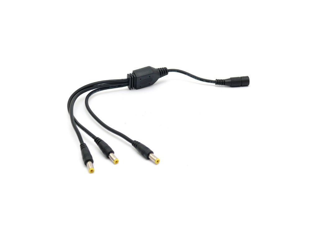 Rozdeľovač napájania s jednou 2,1/5,5 mm zásuvkou a tromi 2,1/5,5 mm zástrčkami.