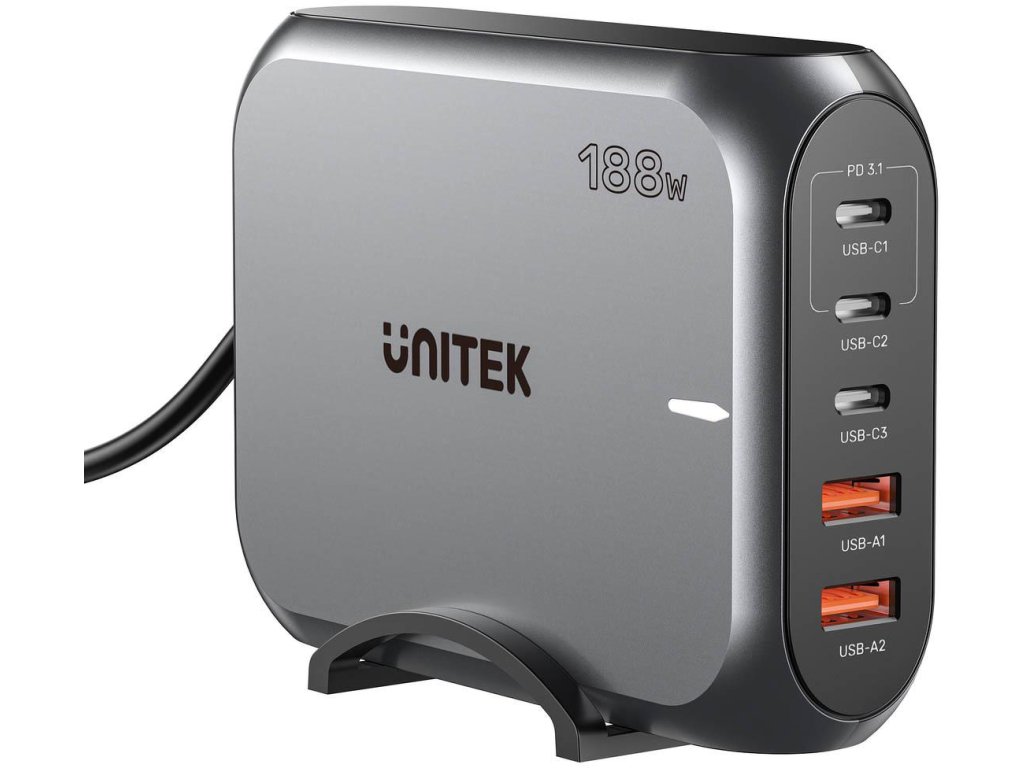 Zabudnite na neprehľadné nabíjačky a obmedzený počet zásuviek. 188W nabíjacia stanica Unitek GaN je kompaktné napájacie centrum, ktoré vám umožní nabíjať až päť zariadení súčasne. Používate jediný zdroj energie a získavate maximálnu funkčnosť a poriadok na stole.