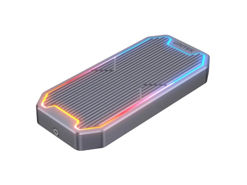 Skriňa M.2 SSD s farebnou RGB LED vytvorená s ohľadom na hráčov. Podporuje prenos dát cez USB3.2 Gen2 10Gb/s SuperSpeed a je kompatibilný so všetkými typmi SSD M.2 vrátane PCIe/NVMe a SATA/AHCI (42 mm / 60 mm / 80 mm).