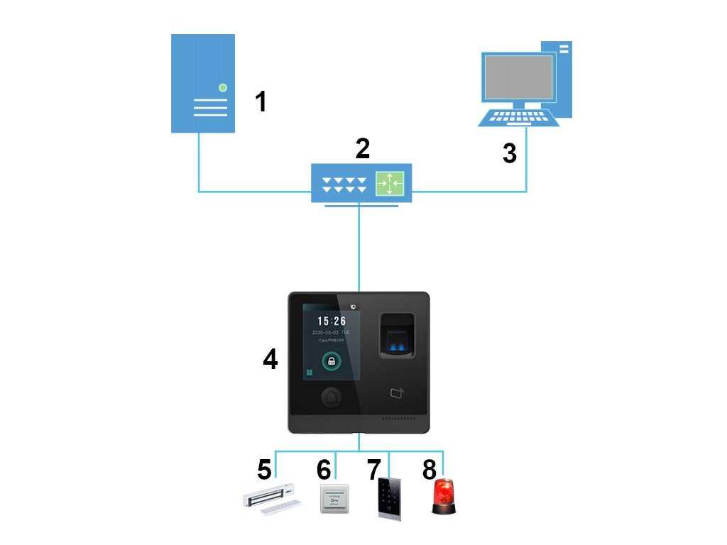 | Funkcie alarmu | Anti-passback, Tabper, Duress, Door Sensor Timeout, Intruder, Illegal Card Exceeding Threshold, Duress Fingerprint |