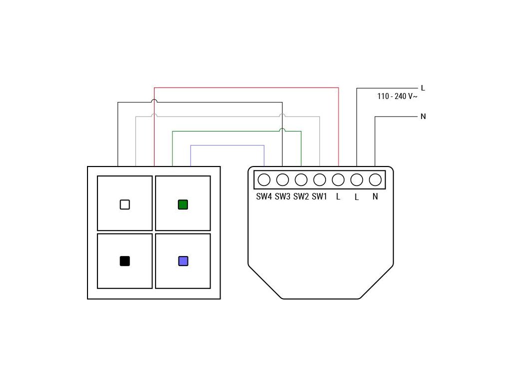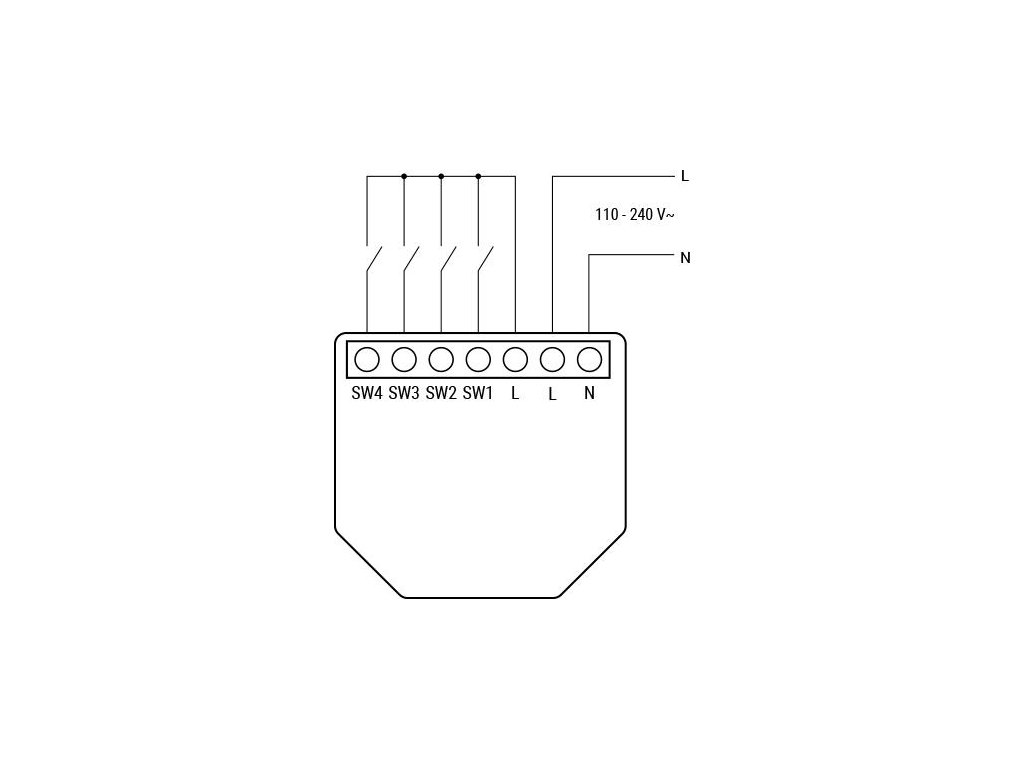 - Ovládanie 4 vstupov - umožňuje pripojiť štyri štandardné tlačidlá alebo spínače a priradiť im akcie (napr. ovládanie svetiel, roliet, alarmu, domácich spotrebičov alebo automatizačných scén).