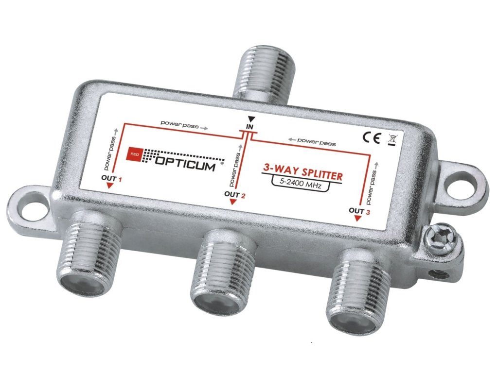 Rozdeľovač na distribúciu jedného signálu do troch prijímačov. Trojnásobný satelitný rozdeľovač od renomovanej značky OPTICUM. Pracuje v pásmach 5-2400 MHz. Prechádza napätie.