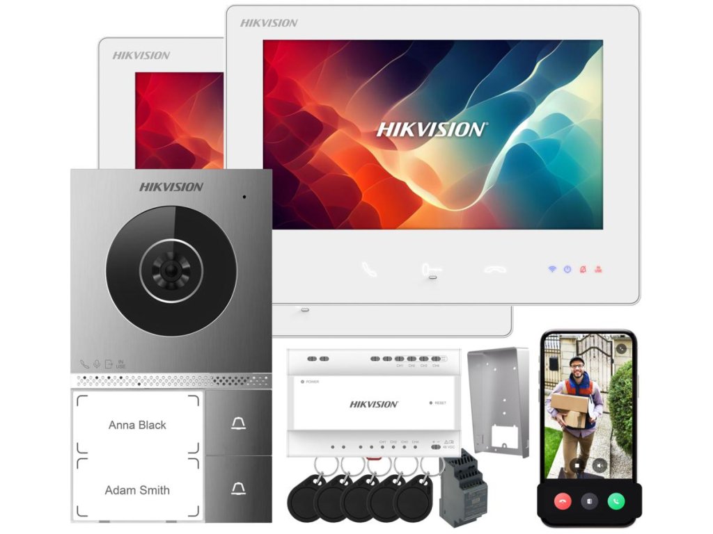SúpravaHikvision DS-KIS705EY-2Monitory je moderný a funkčný videointerkomový systém určený pre dva nezávislé priestory alebo rodiny. Súprava obsahuje vonkajšiu dverovú stanicu s dvoma tlačidlami na privolanie a dva vnútorné 7" monitory s dotykovými obrazovkami, ktoré umožňujú pohodlné a intuitívne ovládanie z rôznych miestností - bez nutnosti používať telefón alebo sa pohybovať po dome.