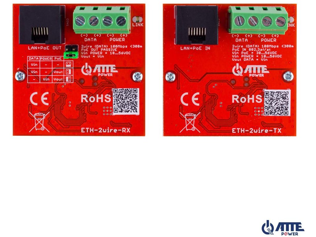 ETH-2wire-SET je súprava aktívnych konvertorov na prenos dát Ethernetu a napájania PoE pomocou 2 vodičov, napr. jedného páru krútenej dvojlinky UTP.