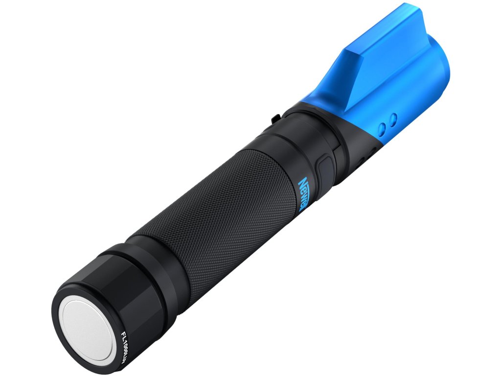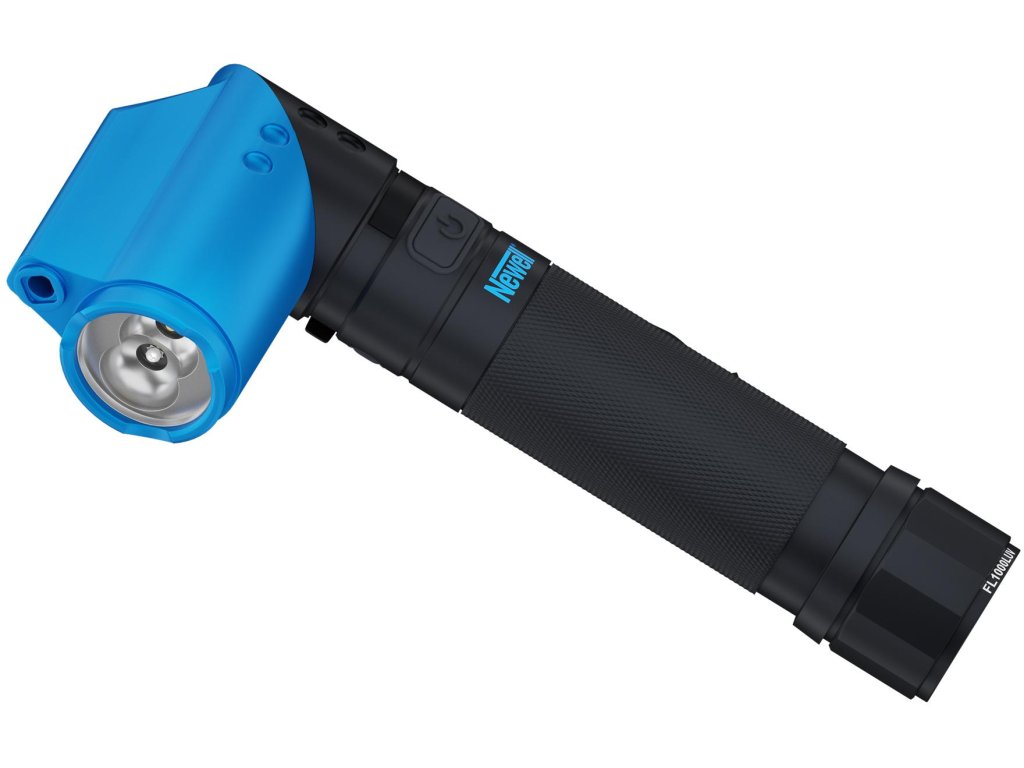Taktická baterka Newell FL1000LUV USB-C s UV žiarením a laserom je vybavená pohyblivou hlavou, ktorú možno nastaviť v uhle 90 stupňov k rukoväti. To je nevyhnutné, ak chcete baterku používať ako čelovku alebo ako zdroj svetla pripevnený k popruhom batohu. Nastavenie hlavy pod uhlom tiež umožňuje, aby svetlo ľahšie dosiahlo na ťažko dostupné miesta.