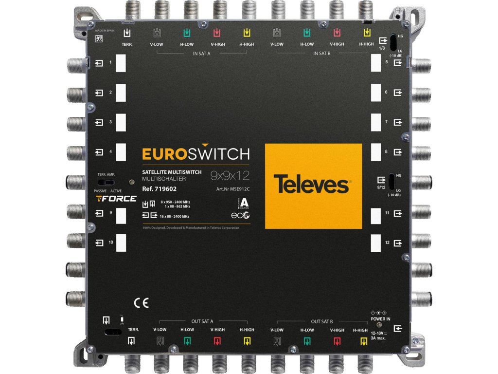 Kompaktný multiswitch s 9 vstupmi (1 pozemný vstup a 8 vstupov pre dva satelity, každý so štyrmi polarizáciami) a 12 užívateľskými výstupmi.