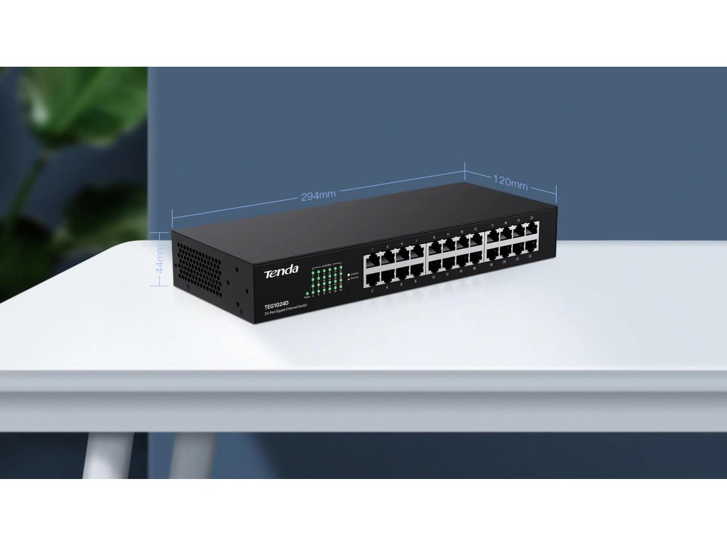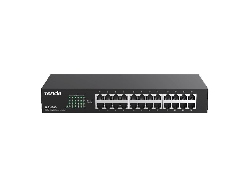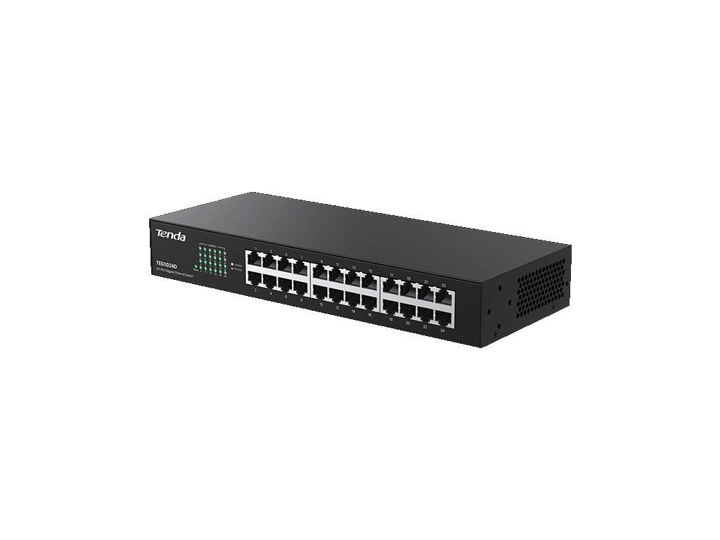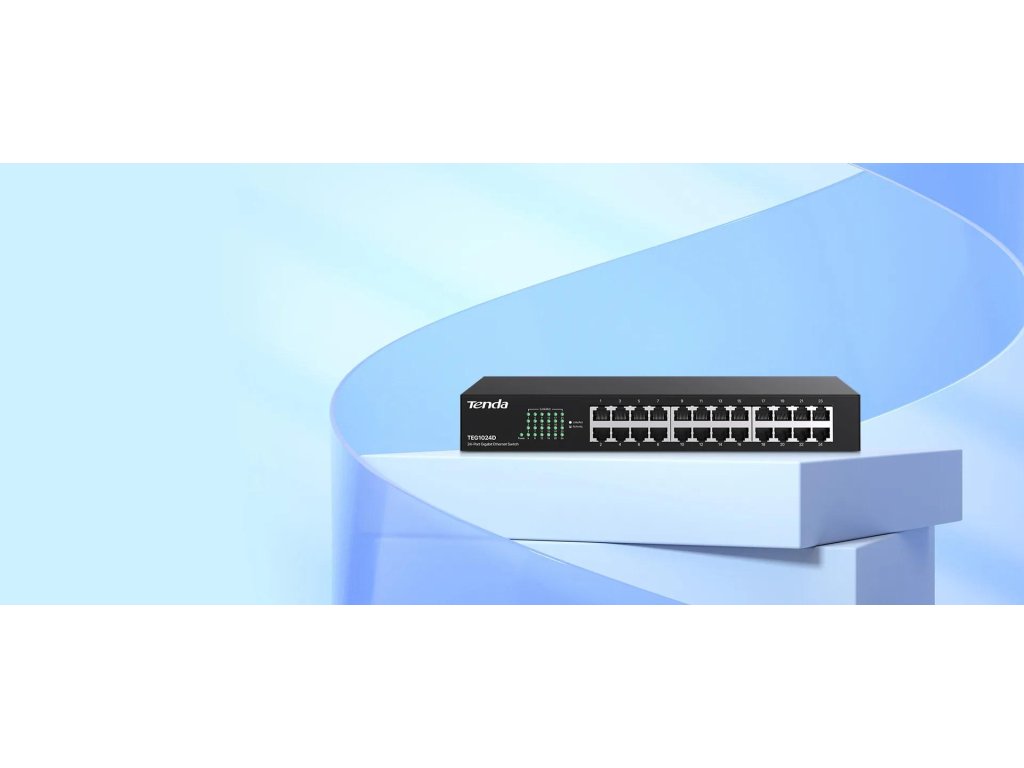 Prepínač Tenda TEG1024D je 24portový prepínač s podporou gigabitového ethernetového pripojenia. Každý z 24 portov zariadenia má funkciu automatického kríženia MDI/MDIX, ktorá umožňuje rýchlu inštaláciu bez nutnosti kontrolovať typ použitých káblov. Okrem toho zariadenie spĺňa štandard 802.3az (EEE), známy aj pod pracovným názvom Energy-Efficient Ethernet, ktorý definuje nižšiu spotrebu energie a prevádzku bez ventilátorov. Prepínač je postavený na špičkovom čipe Broadcom StrataConnect-series. Špeciálna spoľahlivá konštrukcia zabezpečuje, že napájanie a porty sú chránené proti indukčnému blesku s napätím až 6 kV. Gigabitové rýchlosti a prepínacia kapacita až 48 Gb/s poskytnú efektívny základ aj pre tie najnáročnejšie aplikácie. Zariadenie umožňuje rýchly prenos veľkých súborov a grafiky cez sieť a streamovanie pre aplikácie, ako sú multimédiá, VoIP, videokonferencie a online hry, bez akéhokoľvek rušenia alebo oneskorenia.