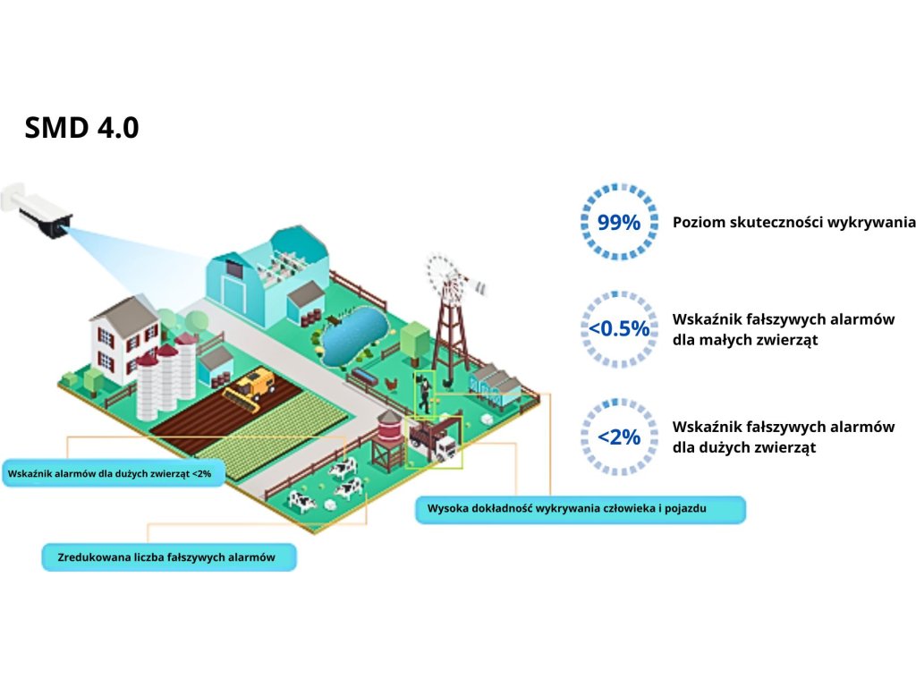Kamera podporuje pokročilé funkcie monitorovania, ako napríkladdetekcia narušenia aprekročenie linkyktoré rozlišujú medzi pohybom vozidiel a osôb. Je to presný nástroj pre náročné bezpečnostné systémy. Okrem toho kamera monitoruje akékoľvek anomálie, ako naprdetekcia pohybu, zmena scény alebo problémy s kartou SD, čo umožňuje rýchlu reakciu na akékoľvek anomálie.
