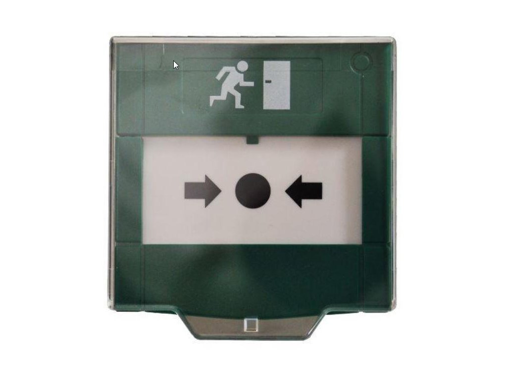 Tlačidlo núdzového uvoľnenia dverí pre systémy kontroly prístupu. Náhodné otvorenie je chránené plexisklom.