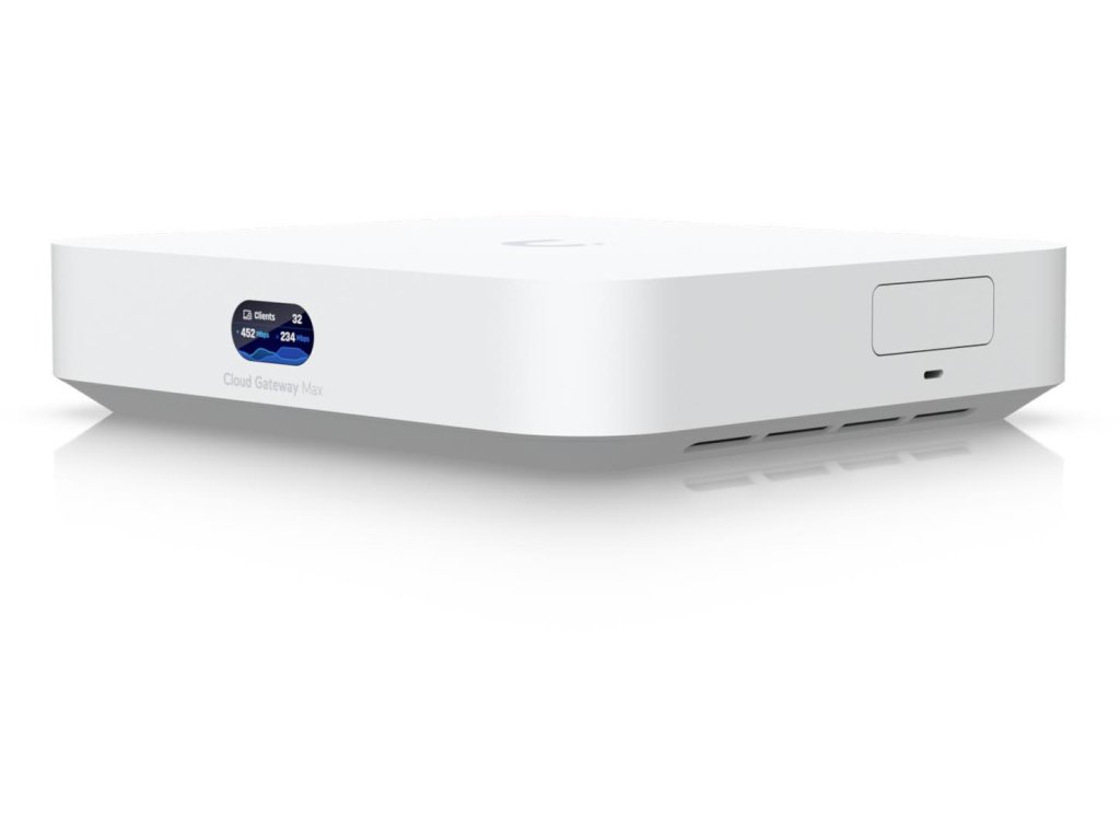 Ubiquiti UniFi Cloud Gateway Max (UCG-Max) je výkonná a kompaktná 2,5G UniFi Cloud Gateway s podporou viac ako 30 zariadení UniFi, viac ako 300 klientov, 1,5Gb/s IPS smerovaním a zabudovaným 512GB NVMe SSD úložiskom pre NVR. UCG-Max je Site Manager s úplným zabezpečením IPS a podporou viacerých sietí WAN.