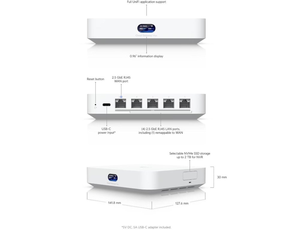 Ubiquiti UCG-Max je vybavený 5x 2,5G gigabitovými ethernetovými portami, vrátane 1x portu WAN a 4x portov LAN. UniFi Cloud Gateway Max podporuje sieť UniFi. Spravuje viac ako 30 zariadení siete UniFi a viac ako 300 klientov. UCG-Max dokáže smerovať prevádzku rýchlosťou až 1,5 Gb/s s IDS/IPS. Bezpečnostné funkcie, ako je identifikácia zariadenia, identifikácia prevádzky, obmedzenia krajiny a blokovanie reklám, možno zapnúť bez toho, aby to ovplyvnilo výkon smerovania.