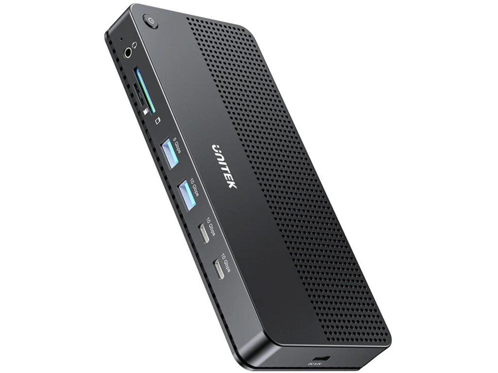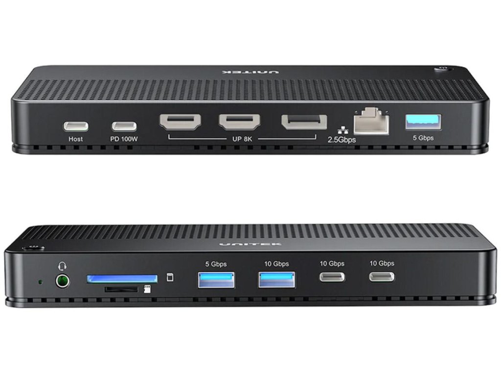 Sloty na pamäťové karty SD a Micro SD, tri video konektory (2xHDMI a 1xDisplayPort), tri konektory USB-A, dva konektory USB-C, 3,5 mm jack konektor a RJ-45 Ethernet - dokovacia stanica Unitek má všetko, čo potrebujete, a ešte viac! Využíva celkom päť portov USB-C - dva na nabíjanie zariadení, dva na vysokorýchlostný prenos dát a posledný na pripojenie počítača.