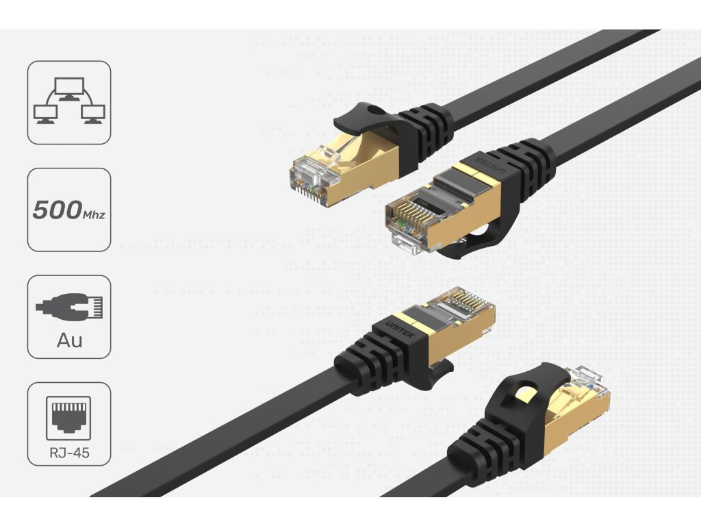 - Sieťové káble Unitek 7. kategórie umožniť rýchle a stabilné pripojeniepočítač, smerovač, server NAS, konzolaalebo iné zariadenie na Internet alebolokálna sieť.