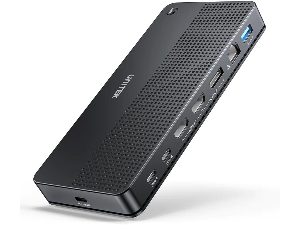 Dokovacia stanica KVM je zariadenie, ku ktorému môžete pripojiť všetky periférne zariadenia a až dva počítače súčasne - teraz môžete jednoducho ovládať ovládanie každého z pripojených zariadení. Na prepínači KVM nájdete sloty pre pamäťové karty SD a Micro SD, dva konektory HDMI, jeden konektor DisplayPort, tri konektory USB-A a dva konektory USB-C. K dispozícii je aj 3,5 mm jack konektor a zástrčka pre sieťový kábel RJ-45. Počítače k príslušenstvu pripojíte prostredníctvom samostatných vyhradených zásuviek hostiteľ-USB C.