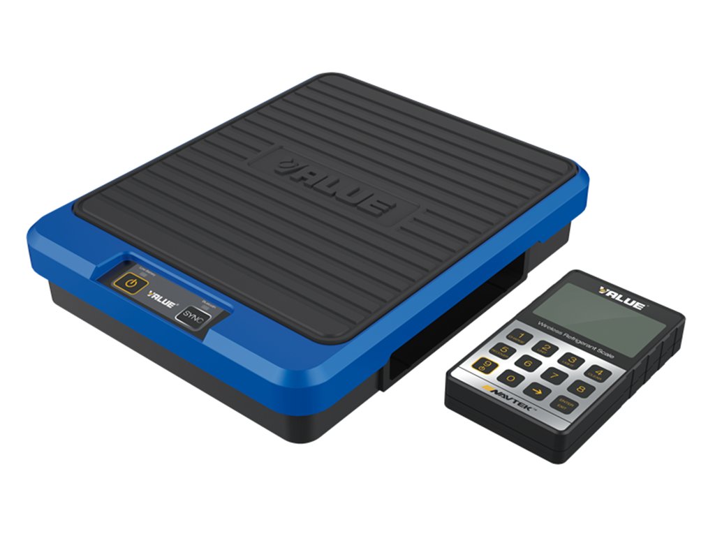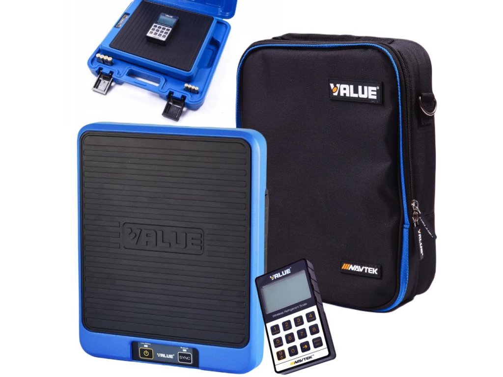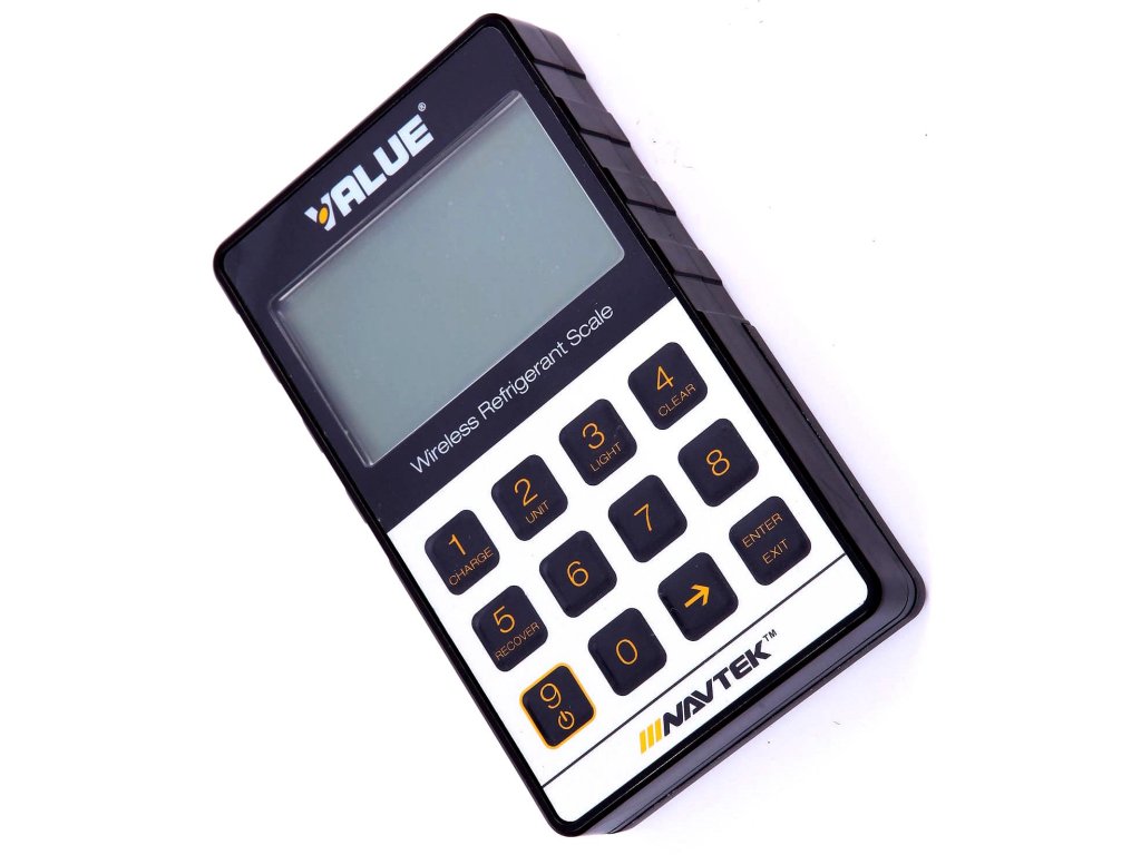 Elektronická váha s bezdrôtovým displejom používaná pri servise chladiacich a klimatizačných systémov.