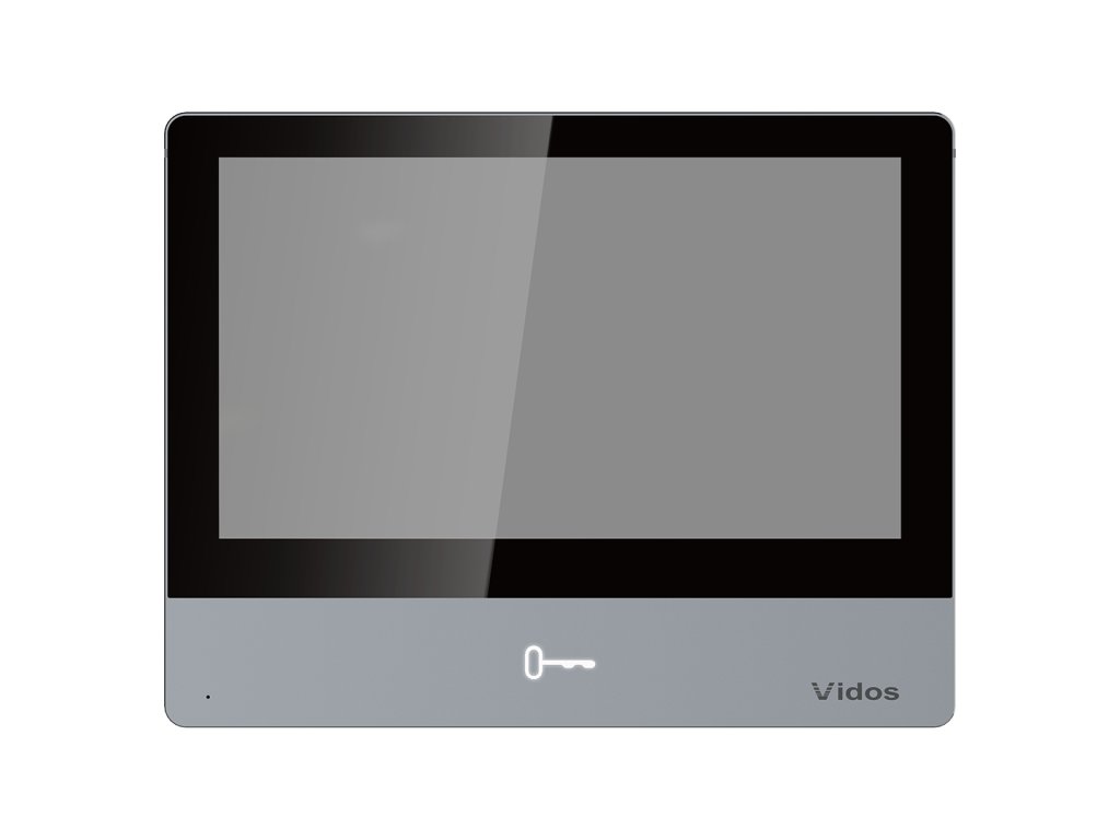 Vnútorná jednotka videovrátnika VIDOS ONE. Monitor umožňuje komunikáciu s dverovou stanicou, zobrazenie obrazu zo všetkých IP kamier v systéme a správu poplachových senzorov integrovaných do videointerkomu.