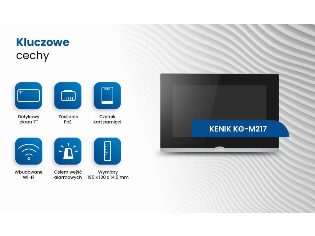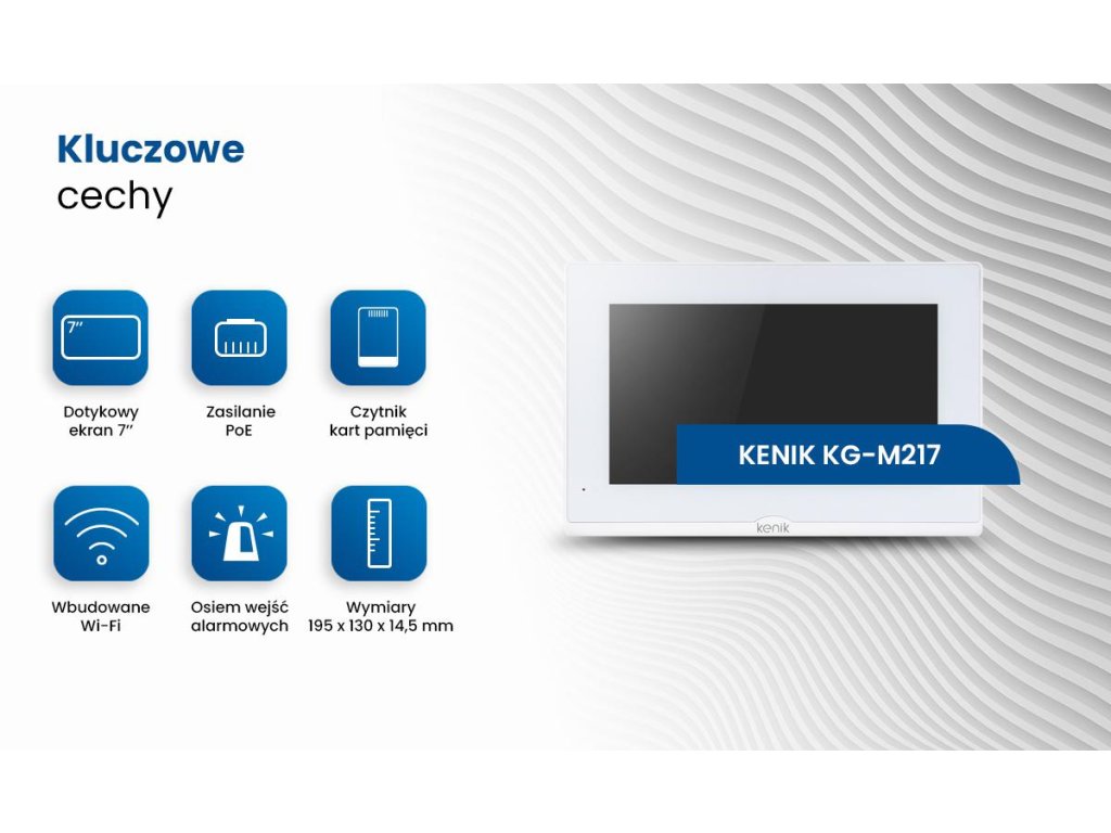 - Minimalistickýdizajn vnútornej videostanice KENIK KG-M217W zdôrazňuje modernosť a eleganciu zariadeniačo z neho robí atraktívny dekoratívny prvok v každom interiéri. Vďaka neutrálnym farbám a jednoduchým líniám monitor dokonale zapadne do moderného aj klasického prostredia.