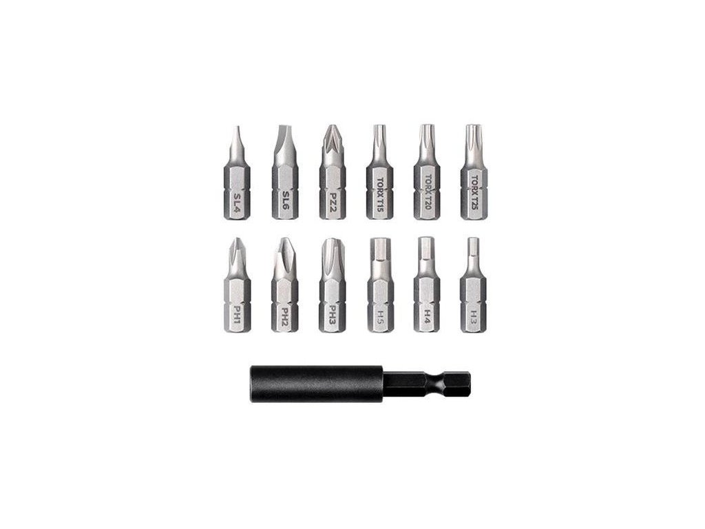 - Súprava obsahuje sada 12 bitov z ocele S2 najvyššej kvality . Dodatočný nadstavec umožňuje prístup do úzkych a ťažko prístupných oblastí. Všetky sada je zabalená v praktickom puzdre aby ste mali všetky prvky na jednom mieste.