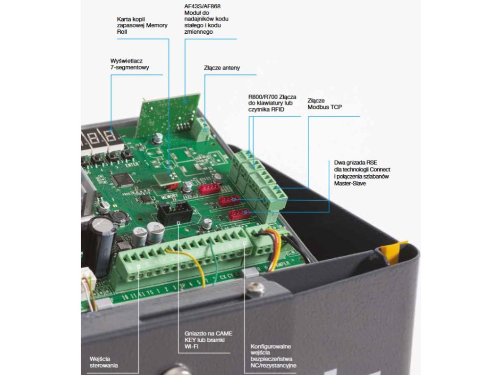 - Konfigurovateľné ovládacie a ochranné vstupy pre príslušenstvo ako kontakty NC alebo odporové kontakty (8k2).