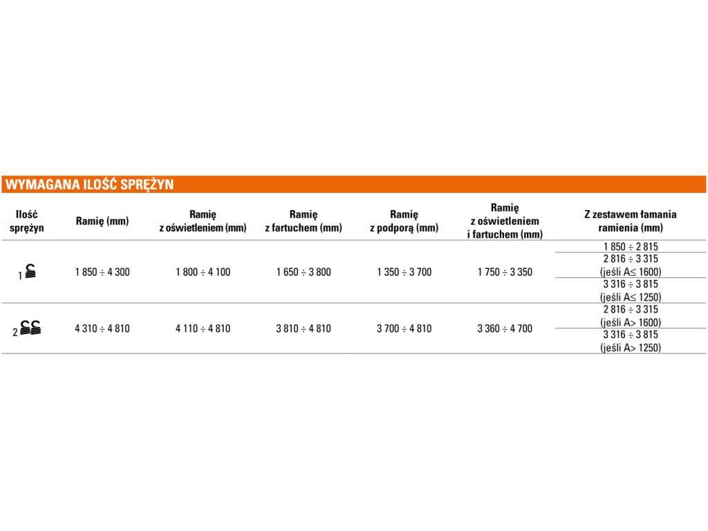 Počet potrebných pružín v závislosti od použitého príslušenstva (obdĺžnikové ramená)