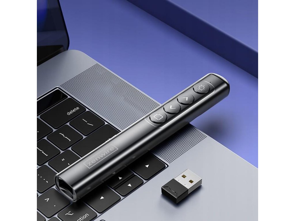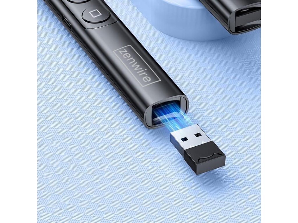 Laserové ukazovadlo Zenwire S9 má ergonomický tvar ktorý umožňuje pohodlne sa drží v ruke. Bezdrôtový prijímač USB možno uložiť do indikátora, takže ho budete mať vždy pri sebe a nikdy ho nestratíte. Má niekoľko funkcií na uľahčenie prezentácie ako je bezdrôtové prepínanie snímok.