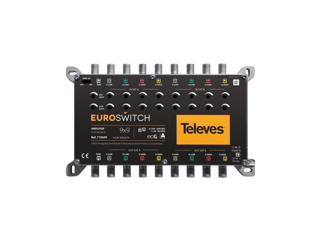 Kompaktný zosilňovač s 9 vstupmi (jeden pozemný vstup a štyri polarizácie z dvoch satelitov) na zvýšenie počtu používateľov zariadenia optimalizáciou signálu. Zisk približne 27 dB v pozemnom pásme a 31 dB v satelitnom pásme.