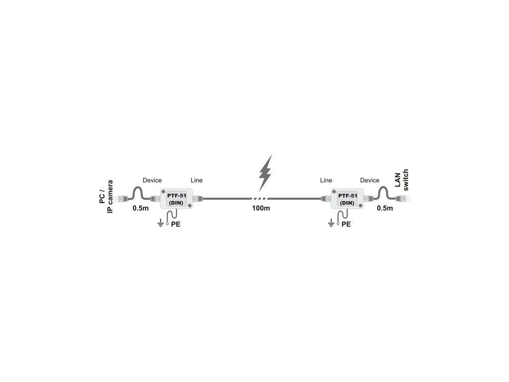 PTF-51-EXT/PoE/T je určený na inštaláciu v blízkosti koncových bodov LAN, ako sú počítače, PLC, IPC kamery, rádiové vysielače, zariadenia internetu vecí. Pre správnu prevádzku je potrebné správne uzemnenie pomocou PE vedenia a najlepšie čo najkratšieho vyhradeného uzemňovacieho bodu. Dodržiavajte smerovú prevádzku ochrannej funkcie opísanú v návode na obsluhu a nezamieňajte zapojenia zariadenia v inštalácii LAN, čo môže spôsobiť nesprávnu prevádzku alebo dokonca poškodenie.